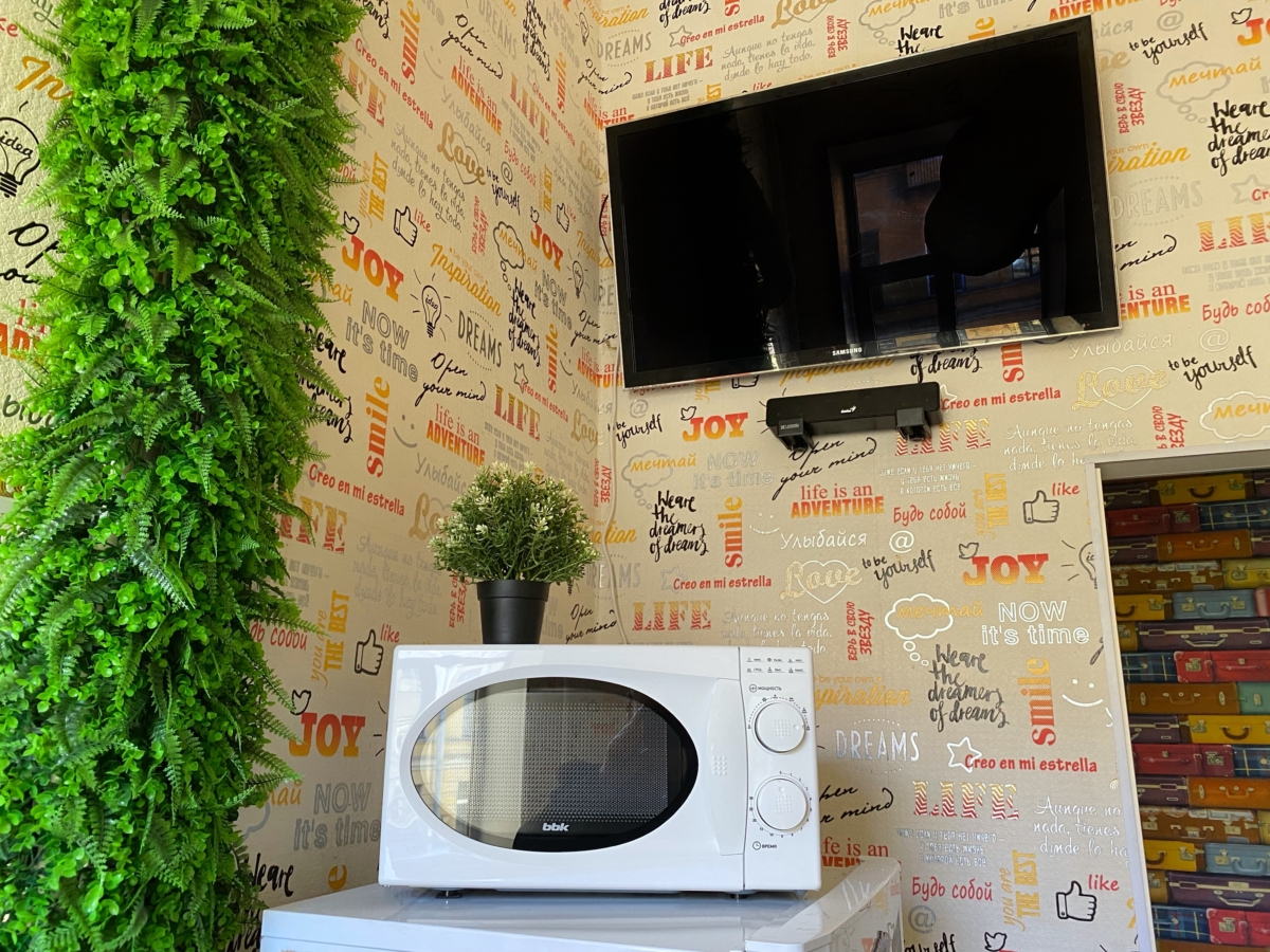 Мы предлагаем тихие комнаты на 1-2 человек с современной мебелью и удобными кроватями (в мае 2025 мы заменили матрасы на двуспальных кроватях). На кухне имеется большой телевизор и все необходимое для приготовления пищи, а в каждой комнате — индивидуальный набор посуды. Кроме того на общей территории есть фен, утюг с гладильной доской, стиральная машина. Постельное белье, полотенца, одноразовые махровые тапочки (а также — чай, кофе, сахар, гель для душа и стиральный порошок) предоставляются бесплатно.