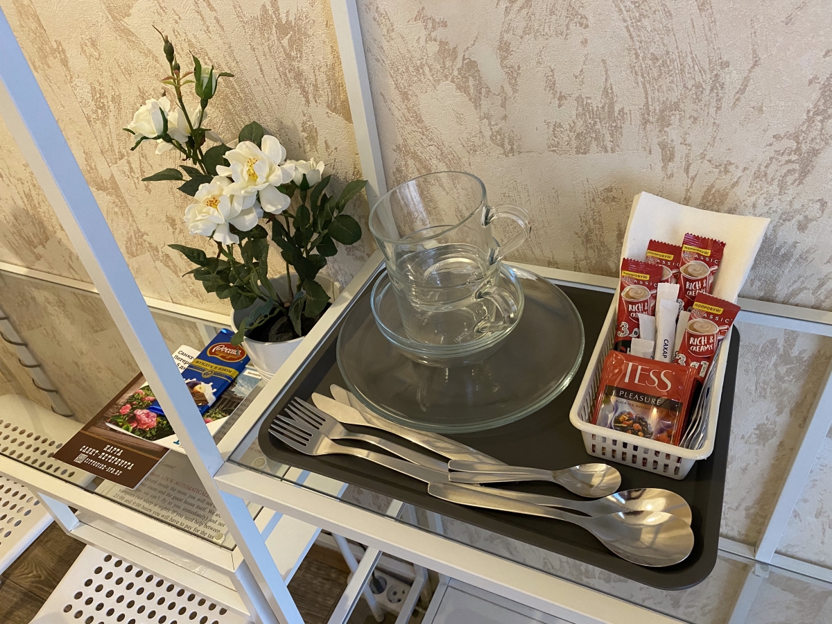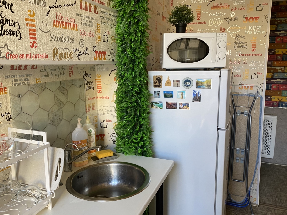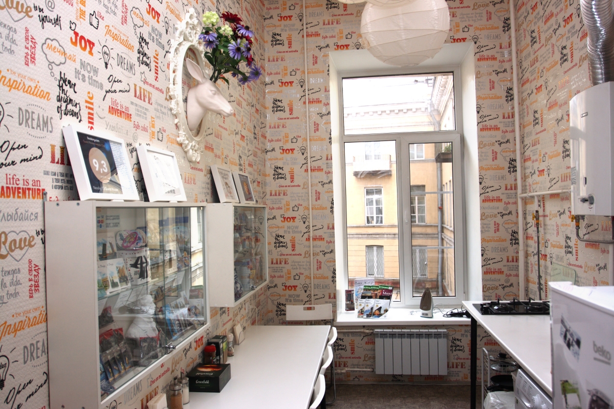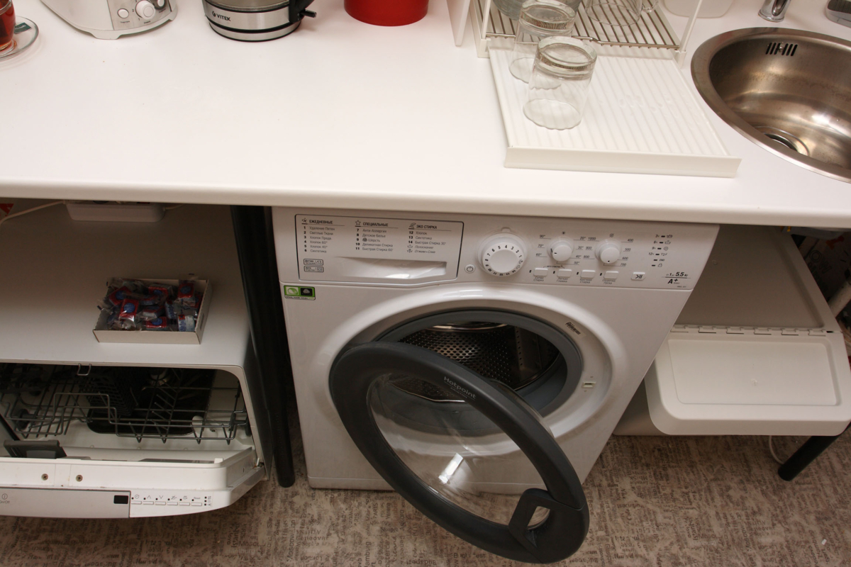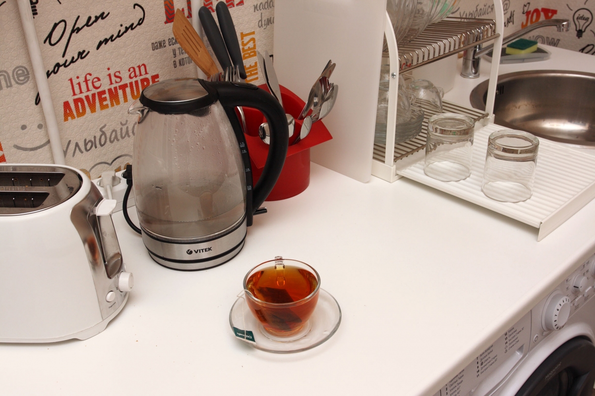 Кухня оборудована всем необходимым — от стиральной машины до чашек, тарелок и столовых приборов. Чай, кофе, сахар (а так же средства для стирки и мойки) предоставляются бесплатно!